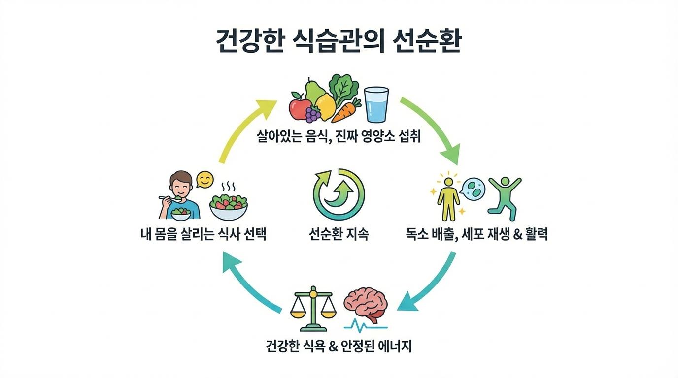 이제 스스로에게 질문을 던져보십시오. "나는 무엇을 위해 먹고 있는가?" 그저 허기를 채우거나 스트레스를 풀기 위해 먹고 있다면, 이제는 멈춰야 할 때입니다. 당신의 몸을 구성하고, 내일의 에너지를 만드는 진짜 재료를 선택하십시오. 그것이 건강을 되찾는 첫걸음이 될 것입니다.
