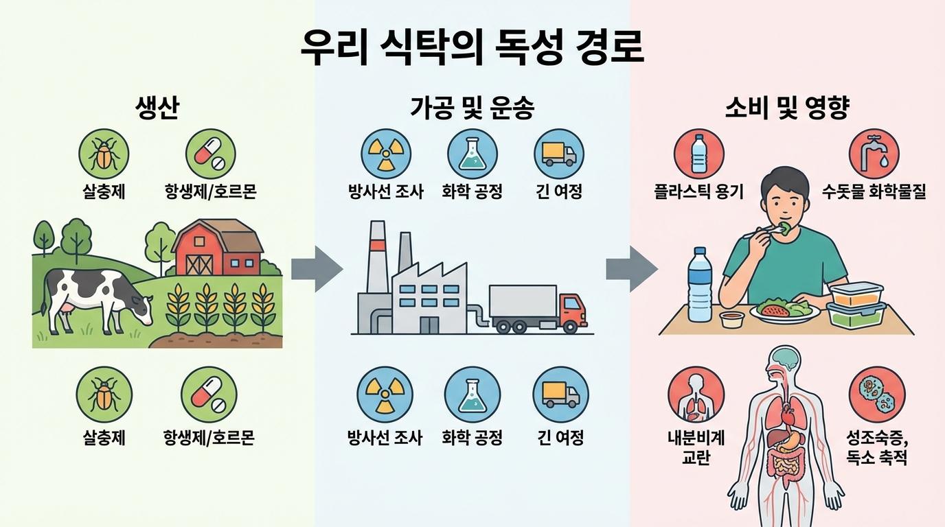 우리는 단 한 가지의 독소에만 노출되는 것이 아닙니다. 수천 가지의 화학물질이 우리 몸 안에서 만나 서로 반응하고 상승 작용을 일으키는, 이른바 '독성의 오케스트라' 속에 살고 있습니다. 편리함에 취해 슈퍼마켓 진열대에서 무심코 집어 든 가공식품들이 실은 우리 건강을 위협하는 시한폭탄일 수 있음을 인지하고, 가능한 한 자연에 가깝고 가공되지 않은 식재료를 선택하는 지혜가 필요한 시점입니다.